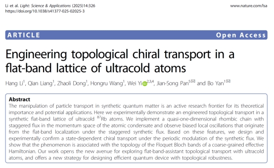 近日,yl6809永利官网潘建松研究员与浙江大学、中国科学技术大学等单位的合作者在Nature出版集团旗下顶级光学期刊《Light: Science & Applications》(中科院一区,近五年影响因子23.1)上发表了题为“Engineering topological chiral transport in a flat-band lattice of ultracold atoms”的研究论文。该研究在超冷原子实验中实现了一种基于平带局域效应的拓扑手性输运机制,为拓扑量子器件的设计提供了新思路。浙江大学李航和梁茜博士为共同第一作者,潘建松研究员与浙江大学颜波教授为共同通讯作者,中国科学技术大学易为教授为重要合作者。