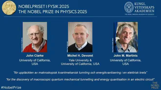 瑞典皇家科学院于北京时间2025年10月7日宣布,将2025年诺贝尔物理学奖授予美国加州大学伯克利分校约翰·克拉克(John Clarke)、耶鲁大学米歇尔·德沃雷(Michel H. Devoret)与加州大学圣芭芭拉分校约翰·马丁尼斯(John M. Martinis),以表彰他们在“电路中实现宏观量子隧穿与能级量子化(for the discovery of macroscopic quantum mechanical tunnelling and energy quantization in an electric circuit)”的杰出贡献。